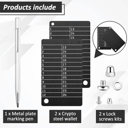 * Cantidad de productos: recibirás un juego 2 en 1 de carteras bitcoin de acero con tornillos de bloqueo a juego y 1 bolígrafo de marcado de placa de metal.